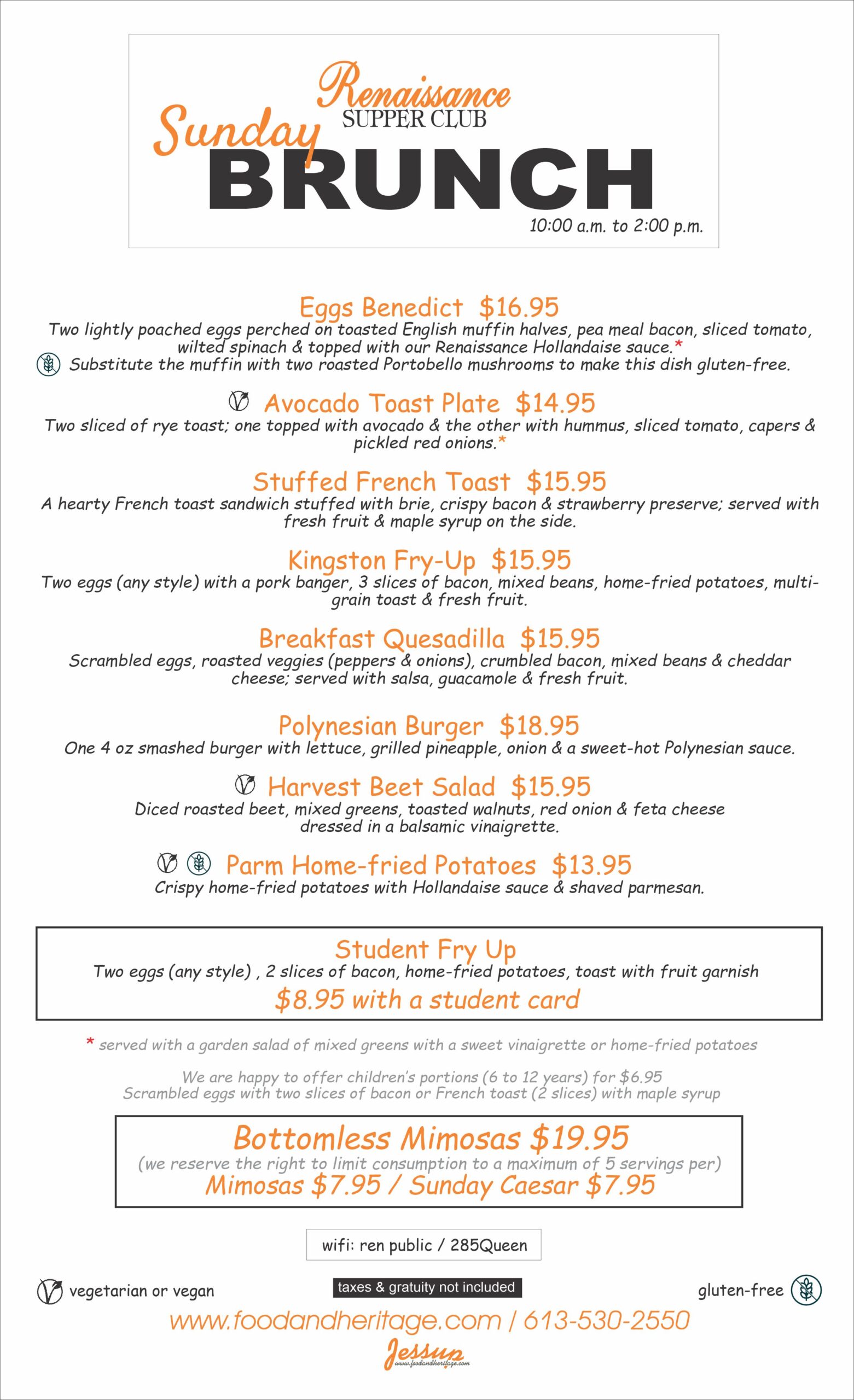 Kingston’s most fun Sunday Brunch is back with a refreshed menu and our famous “bottomless” brunch feature. Large groups are welcome and our prices have been tempered to reflect challenging economic times! See our new STUDENT FRY UP featured for just $8.95 with a valid student card.